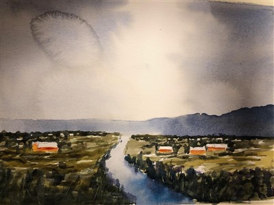 Vi följde Daniel steg för steg, teckna upp med lätt hand, måla med mycket vatten himmel och bäck, låta torka, måla landskapet, men lämna små vita ytor för hus och livfullhet. Sen måla husen, de mörkblå bergen och mörka ned landskapet i fjärran. För att få perspektiv, mörkare grönt kring husen. Nu förgrunden, där bäckens vattenyta får en varmare ton, omgivande träd mörkas och trädens färg låter sig spridas och speglas ner över vattenytan. För att bättre urskilja träden i förgrunden, bra rispa lite med en nagel eller något vasst.