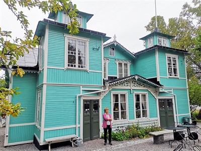Olle Olssons dotter Lena Olsson, som är född och uppvuxen i huset i Hagalund, guidade oss runt och berättade roligt och fängslande om sin pappas konstnärsskap och vad som hände med Hagalund när nästan hela det lilla lokalsamhället revs och höghusen ”Blåkulla” byggdes i början av 70-talet. Under 1960-talet när miljonprogrammet lanserades revs ca 250 äldre trähus i Hagalund. I dag finns det endast tre trävillor kvar runt Olle Olssons hus. Huset var ursprungligen gulmålat men Olle Olsson målade i protest mot rivningarna det i stark turkos färg. Så ser det ut än idag då Solna stad äger huset. Huset är numera ett välbesökt museum fyllt av tavlor och en hel del ursprungsmöbler.
