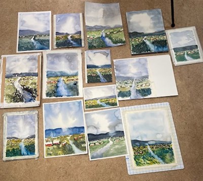Den här dagen skulle vi försöka oss på att måla ett landskap sett på håll med mycket grönska och små enstaka hus utspridda och med blånande berg i bakgrunden. Centralt en vattenspegel i form av en bäck, där träd speglas i vattenytan, allt under en lite hotfull himmel.