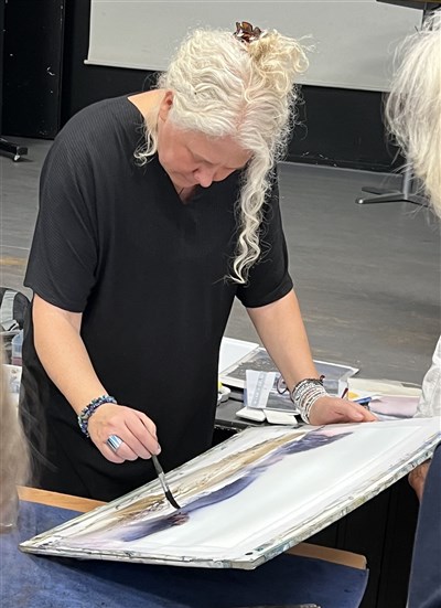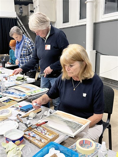 Jenny demonstrerade sitt måleri och berättade om sina färgblandningar med två eller högst tre färger för att ge ett sammanhållet lugn åt bilden: