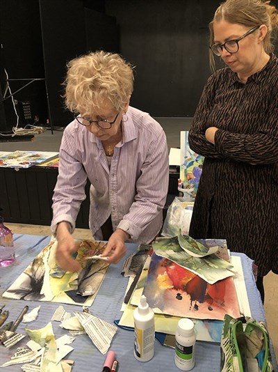 Vi fick tips att riva gamla målningar som collage i den nya. Samtidigt visade Seija sina stora vackra målningar, som innehåller alla dessa moment. Vilken fin inspiration. Nu är det bara att komma loss. Inget kan stoppa oss nu.