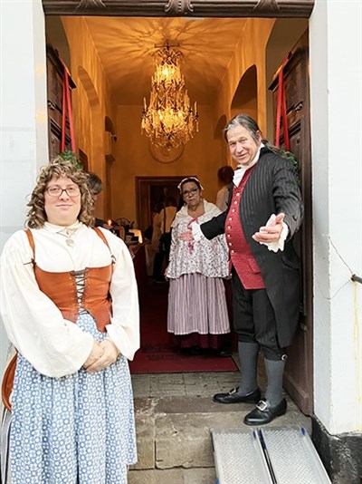 Här serveras Annika och Brigita godsaker från julbordet av en tidsenligt klädd kypare.