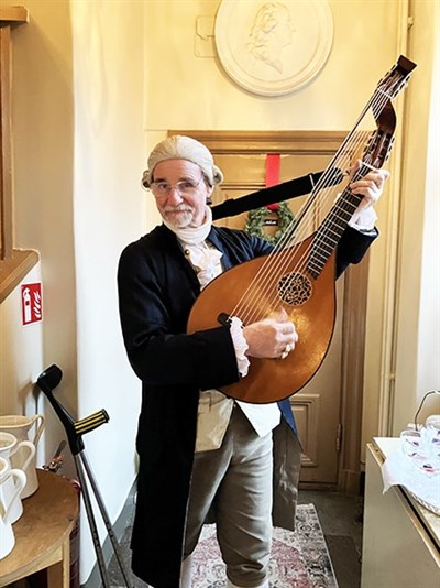 I detta vackra hus fick vi smaka ett överdådigt klassiskt julbord. Förutom allt man kan förvänta och önska sig serverades det julskinka griljerad med pepparkakssmulor efter ett recept av Kajsa Warg. Där fanns också en halstrad salt sill efter ett 1700-talsrecept. Den sillen var verkligen salt!. Under måltiden dök faktiskt självaste Bellman upp med luta. Till kaffet var det avslutningsvis dags för den årliga Julquizen.