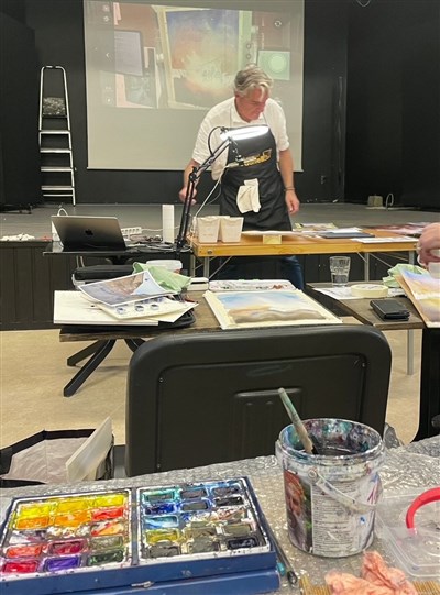 Vilket flöde av färg som mötte oss från väggar, bord och golv vid första insteget i ateljén och samtidigt vilken struktur och ordning! Vid denna träff ingick för oss endast att lyssna - inget egenmåleri. Anders startade bl a. med att säga: ”En bra bild är det viktiga- inte en bra akvarell”. ”Akvarell är en teknik som man kan göra konst av”. Anders använde, förutom akvarell som var grundtekniken för eftermiddagen, material som plast, fjädrar, tårtpapper, rostig plåt m.m. ” Man ska tänka på i vilken anda man går in i målningen” och ”Vart vill jag gå” påpekar han. Anders har minst fyra målningar på gång samtidigt och har alltid en bild med sig som inspiration ”Havererade” akvareller är bra att spara och måla vidare på en annan dag. Problemet med akvarell är att den ”sopar ihop sig” och ”riskerar förlora luft och fräschör”. Anders talar om 1-2-3-måleri vilket innebär vitt +bastoner+ mellantoner. ”Leta efter formen i de målade partierna!” ”För att få fram ljuset måste man ha mörkret”.