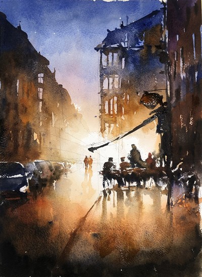 Eftermiddagsgruppen och kvällsgruppen fick olika foton från Stockholm att utgå från och Stefan visade hur han gick tillväga. Först målade han med bred pensel hela det fuktade arket med bakgrundsfärger, himmel och mark. Han aktar sig för att dra penseln fram och tillbaka över pappret utan lägger färgerna bredvid varandra och låter dem flyta ihop med mjuka övergångar och inte för mycket vatten. Lättare sagt än gjort!! Nu gäller det att spara ut de ljusa partierna och ha ordentligt med pigment i det som ska vara mörkt. I de vita, torra målade Stefan figurerna som ska vara i fokus och ge liv och rörelse. Här använde han en mycket liten pensel och väldigt tjockt med färg. Det ger en ”krispig” känsla.