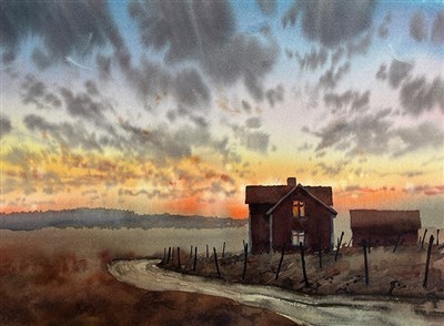 ”Under kursen kommer jag demonstrationsmåla en stämningsfull kvällshimmel, med en kontrasterande byggnad. För ytterligare djup och riktning adderar jag pålar eller staket.