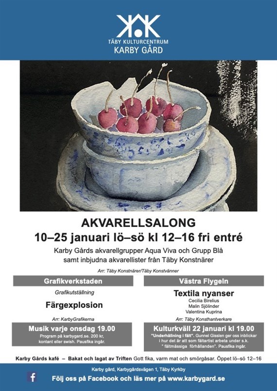 Vi kör igång det nya året med Karby Gårds Akvarellsalong, som i år omfattar verk av 22 konstnärer varav fler än hälften är medlemmar i Spray.