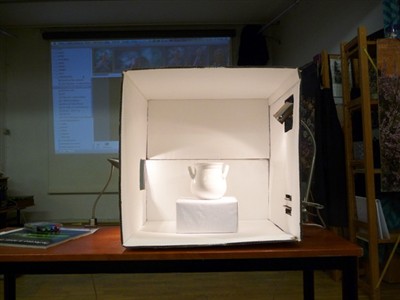Placeringen av egenskuggor, slagskuggor och kärnskuggor är viktig, Anna illustrerade detta med en vit kruka i en ljuslåda. Och plötsligt förstod vi vad Anna menade med att måla ljus. Att lägga den mörkaste egenskuggan lite närmare ljusets infallsriktning var nytt för många av oss, och det lyfte verkligen våra försök att återge volym och form i de runda föremålen. Vi fick också inblick i skuggfärger, samspel mellan bakgrund och förgrund samt att återge perspektiv av rundade föremål.