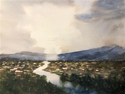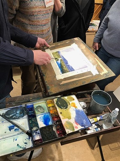 Vi följde Daniel steg för steg, teckna upp med lätt hand, måla med mycket vatten himmel och bäck, låta torka, måla landskapet, men lämna små vita ytor för hus och livfullhet. Sen måla husen, de mörkblå bergen och mörka ned landskapet i fjärran. För att få perspektiv, mörkare grönt kring husen. Nu förgrunden, där bäckens vattenyta får en varmare ton, omgivande träd mörkas och trädens färg låter sig spridas och speglas ner över vattenytan. För att bättre urskilja träden i förgrunden, bra rispa lite med en nagel eller något vasst.