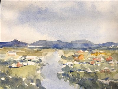 Den här dagen skulle vi försöka oss på att måla ett landskap sett på håll med mycket grönska och små enstaka hus utspridda och med blånande berg i bakgrunden. Centralt en vattenspegel i form av en bäck, där träd speglas i vattenytan, allt under en lite hotfull himmel.