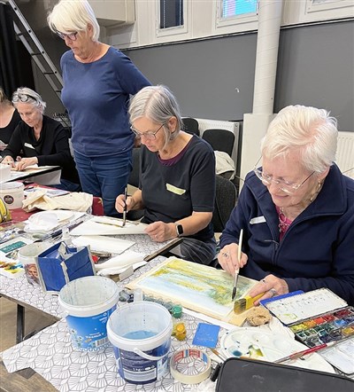 Jenny demonstrerade sitt måleri och berättade om sina färgblandningar med två eller högst tre färger för att ge ett sammanhållet lugn åt bilden: