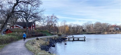 Blockhusudden ligger vid inloppet till Stockholm, långt ut på Djurgården nära Thielska galleriet. Bilden ni ser ovan får ni föreställa er i skir grönska i stället för, i skrivande stund, höstfärger. Vi kommer att hitta många motiv – grönska, vatten och vackra hus. Det finns mycket gott om parkbänkar om man vill sitta bekvämt och måla eller teckna. Längst ut på udden ligger café Blockhusporten som öppnar igen i maj efter vintern.